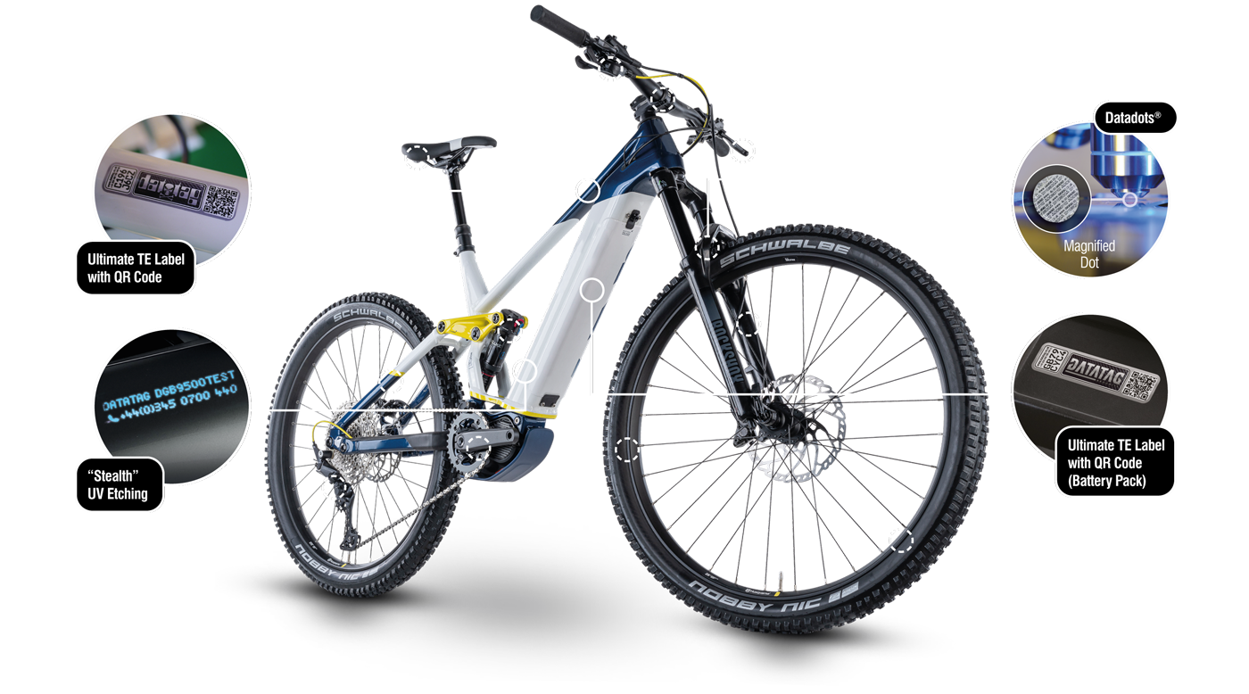 MARQUE l'ensemble de votre cycle avec une technologie de pointe (gravure UV furtive, Datadots, étiquette d'avertissement inviolable avec code QR pour le cadre et la batterie.)